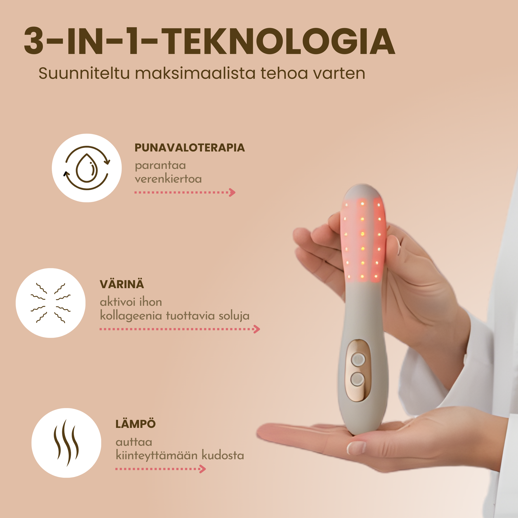 • 3 kliinisesti dokumentoitua teknologiaa yhdessä laitteessa: punavalo (660nm), hellävarainen terapeuttinen lämpö ja soninen värinä.