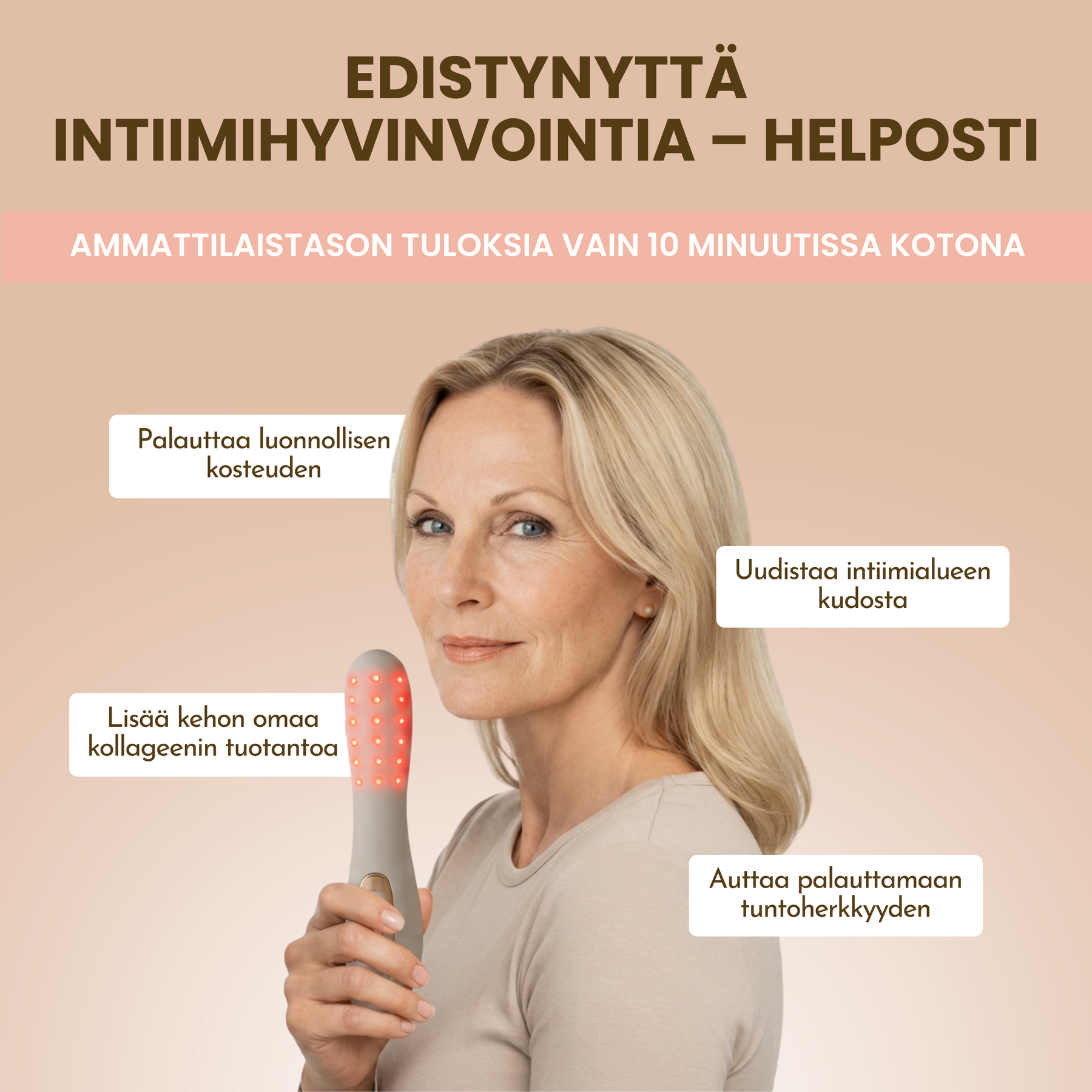 Intiimilaite – vaikuttaa solutasolla. Punavaloterapia stimuloi kehoa uudistamaan kudosta, tuottamaan kollageenia ja palauttamaan luonnollisen kosteuden sisältäpäin.